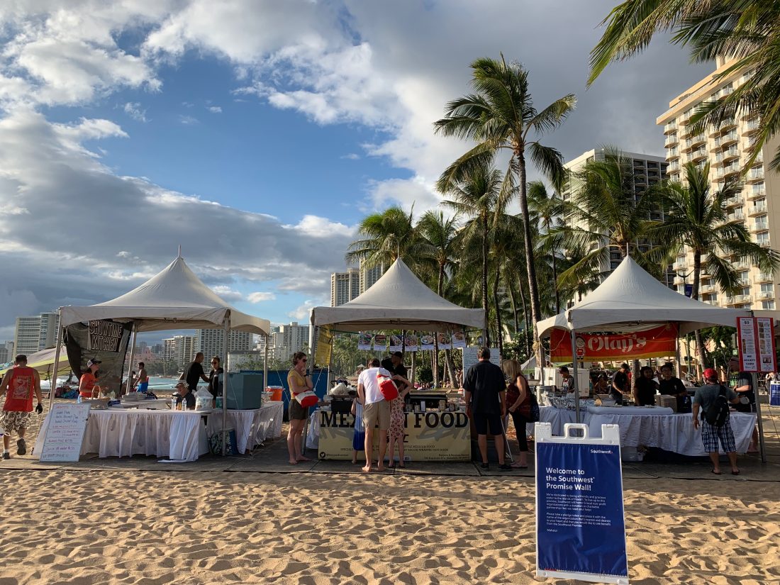 このイベントのメインスポンサー「サウスウエスト航空」のテントでは、毎月先着1000名に無料で配られるロゴ入りグッズもこのイベントの楽しみのひとつです。今月は、赤と白のストライプが可愛いビーチバッグ!