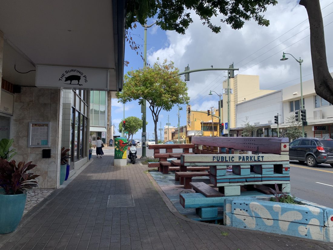 お腹が空いたらとりあえずカイムキに向かう、というローカルもいるほど、和食・洋食・中華・コーヒー専門店・アイスクリーム店など、様々な飲食店が軒を連ねるのがカイムキエリアです。コロナ禍にあってもローカル人気は高く、テイクアウトだけでも連日賑わっていた元気なエリアでもあり、条例を改正して店先の公道にテラス席を作るなど、カイムキの街を盛り上げていこうという「キープ イット カイムキ/Keep it Kaimuki」のスローガンのもと、官民挙げての努力を続けてきた地元愛溢れるエリアでもあります。日本のテレビ番組内でも話題になった長い長い坂道もこのエリアにあります。
