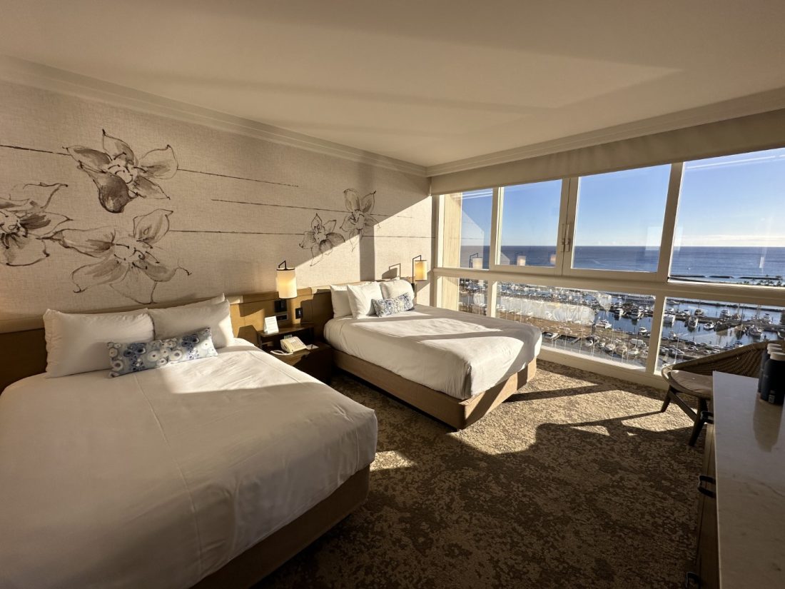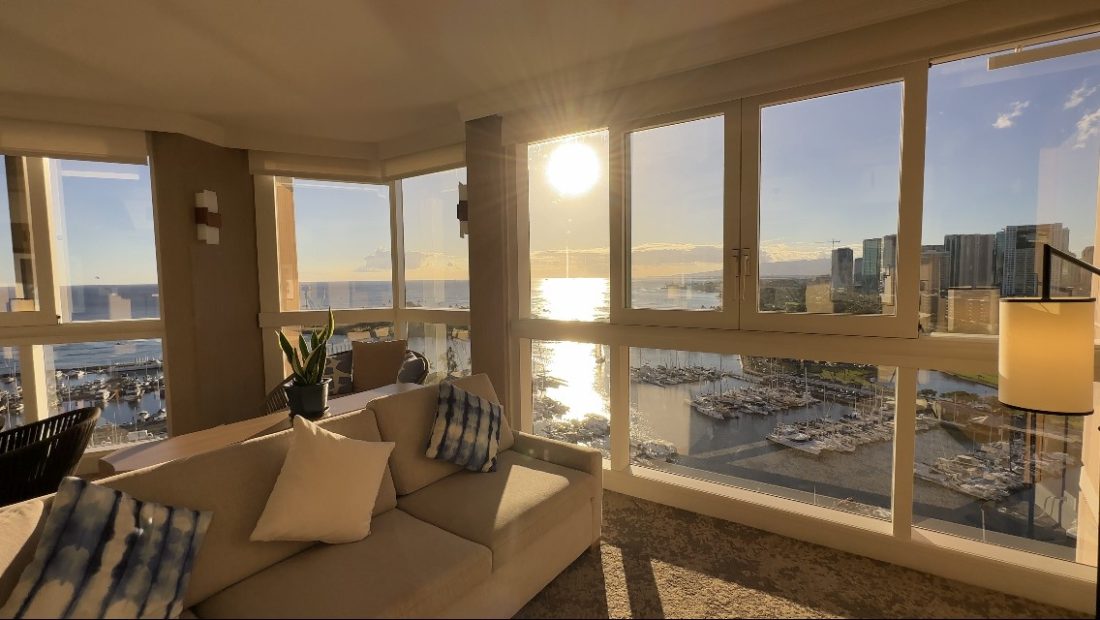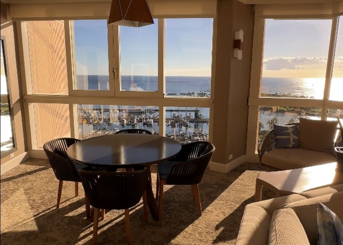 このお部屋以外も、ホテルの客室は全室オーシャンフロント! 床から天井まである窓からの眺めは、低層階ならヤシの木やヨットハーバーが含まれたオーシャンビュー、高層階なら青く広がる太平洋の水平線が見渡せる、遮るものの無いオーシャンビューです。海はもちろん、ワイキキやアラモアナの景色を堪能でき、サンセットの時間に合わせて次々に出港するヨットの行方を眺めていると、リゾートに来たぞーと感じられ、時間を忘れて見入ってしまいます。