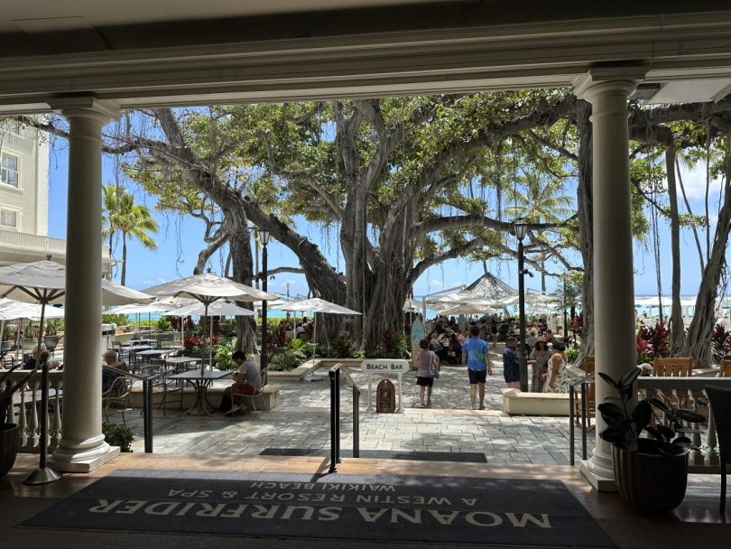 続いてはワイキキ最古の高級リゾートホテル、モアナサーフライダー ウェスティンリゾート&スパへ。こちらから見えるワイキキビーチと大きなバニヤンツリーはいかにもハワイを感じさせる景色ですよね。
