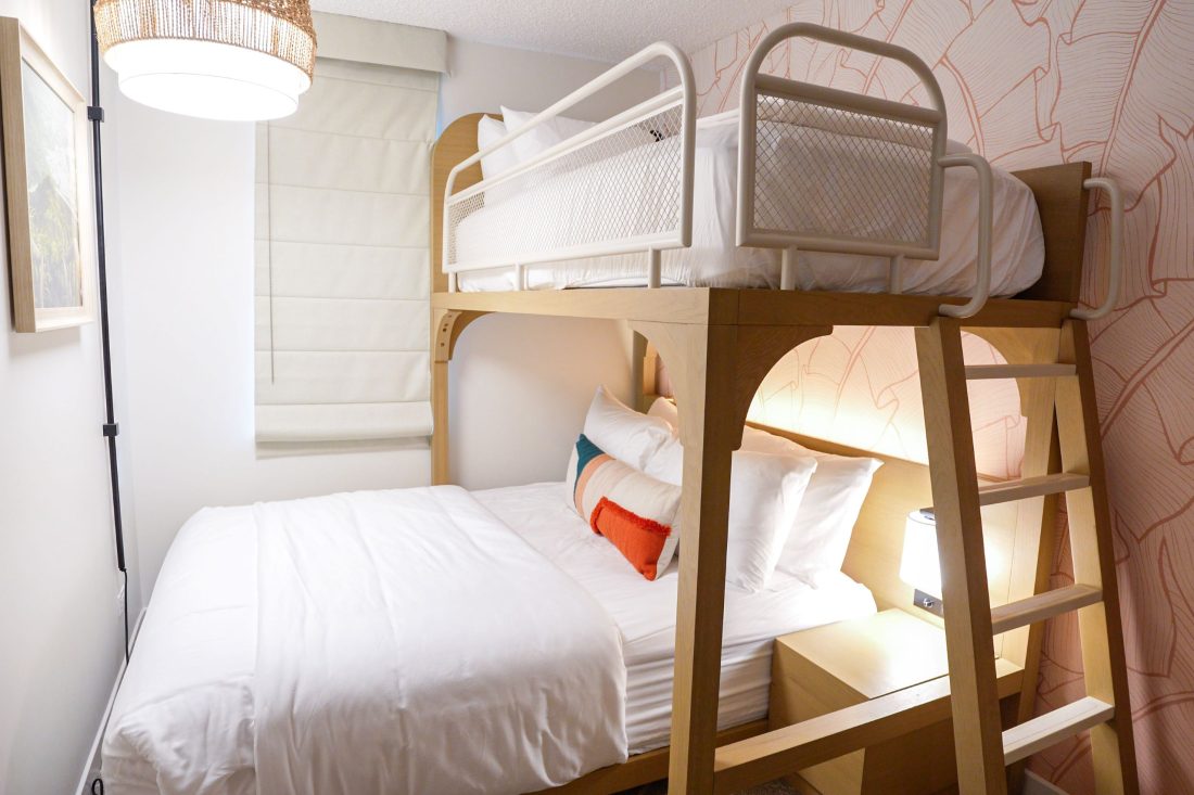 続いてはエヴァタワーのネイバーフッドルーム。ローマー ワイキキのシグネチャーカテゴリーのお部屋へ。キングサイズベッドルームのお隣にワイキキでは初の二段ベッドがあるお部屋です。上がシングルベッド、下がクイーンサイズベッドでこちらのお部屋は大人4名様が宿泊可能です。