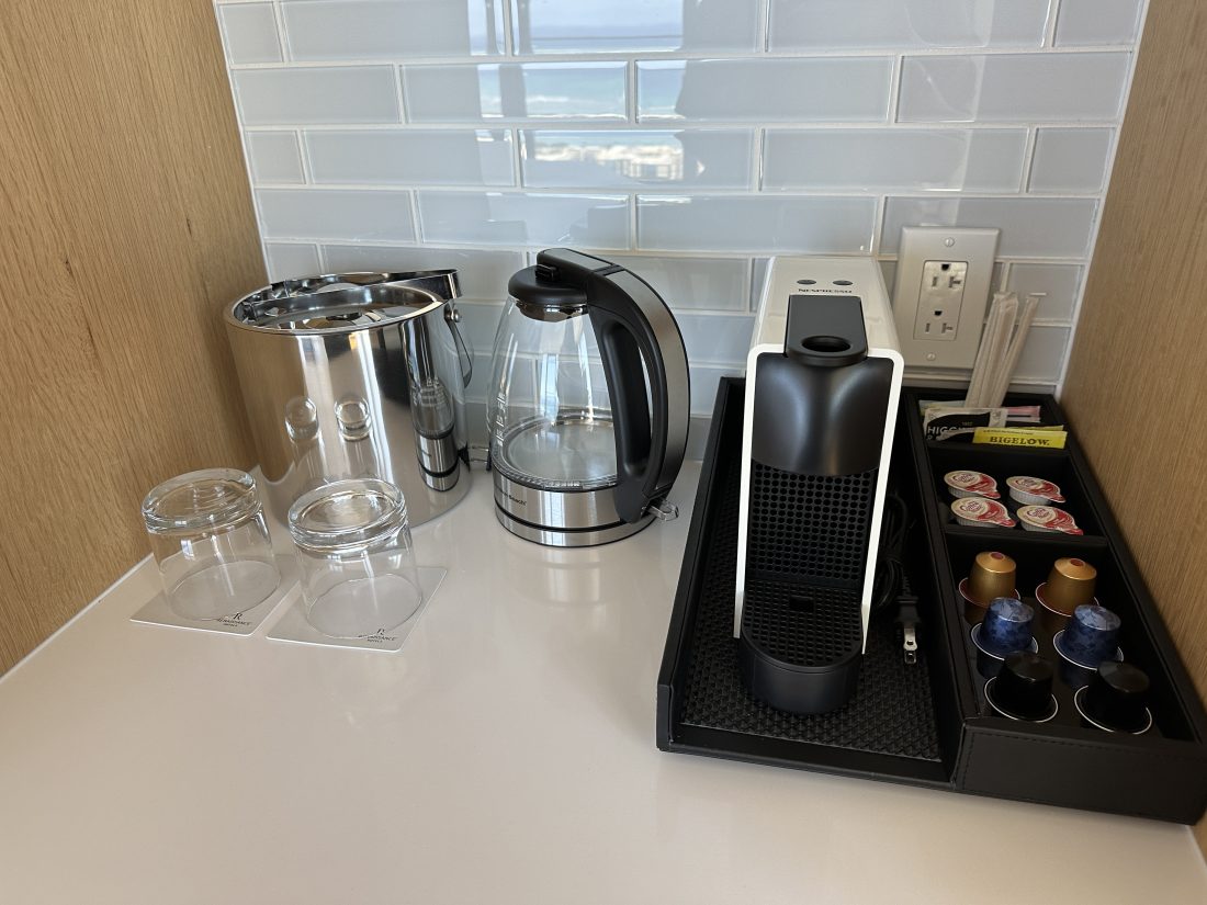 すべてのお部屋にはエスプレッソマシーンと湯沸かしポットが用意され、下の棚には冷蔵庫もあります。