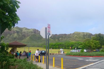 サインなし 料金所付近の待合所ダイヤモンドヘッド入場門を見て左側にある屋根付きのベンチがトロリー乗り場。レアレアトロリーの停留場マークはありません。沢山のトロリーが停車しますので、先にお待ちいただいた方から順番にご乗車ください。ここはワイキキのシンボル、ダイヤモンドヘッド登山への入り口です! スニーカーを着用し、登山の達成感と頂上からの景色をお楽しみください!