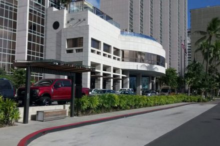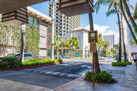 プリンス ワイキキのヨットハーバー側出入口を見て左手にある屋根付きベンチがトロリー乗り場です。プリンス ワイキキはアラワイヨットハーバーに面して建つ日系のデラックスホテル。トロリーを利用すれば、アラモアナセンターまで約10分、ワイキキの中心部までは約20分です。