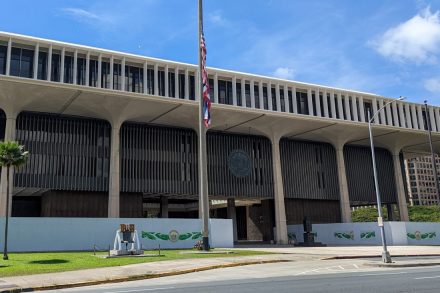 サインなし ポールサイン前の車寄せハワイ州庁舎前にあるダミアン神父像の前の停車帯(正面フラッグポール前)に停車します。レアレアトロリーの停留所マークはありません。