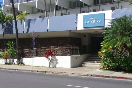 カラカウア通りとクヒオ通りの分岐点に位置するホテル・ラ・クロワのオロハナ通り側出入口前に停留所があります。