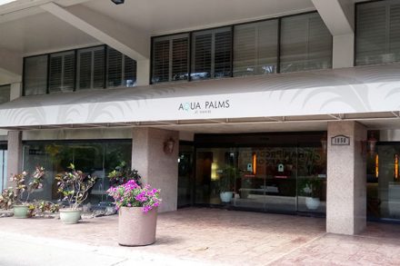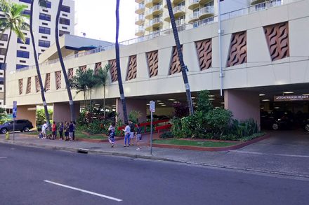 サインなし The Bus看板アラモアナ大通りに面するアクア・パームズ・ワイキキの正面入り口の前にトロリーが停車いたします。レアレアトロリー停留所サインはありません。ヒルトン・ハワイアン・ビレッジ滞在のお客様はこちらも便利です。