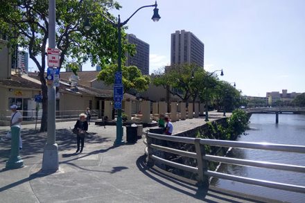 サインなし 史跡看板(カメハメハ大王像イラスト)付近右手がフォスター植物園、前方に小川を渡る橋と後方に見える観音寺の間に停車します。
