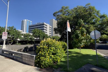 降車後、横断歩道を渡り、左手に進むと、ワンブロック先にハワイ出雲大社があります。