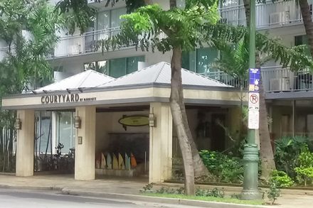 ワイキキの中心に位置するDFSワイキキの山側、クヒオ通りの北側にあるコートヤード・ワイキキビーチの入り口を見て、右手に停留所があります。