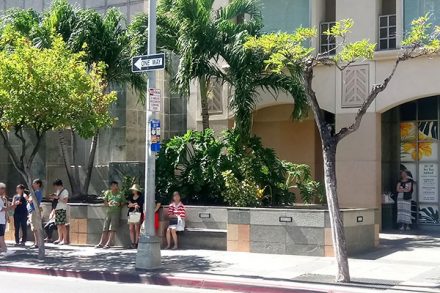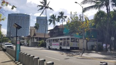 サインなしモダンホノルル付近、The Busの停留所よりもアラモアナセンター寄りの、アラモアナ通り沿いに停車します。レアレアトロリーの停留所サインはありません。