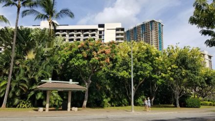 サインなし すぐそばの夜間照明の鉄柱にワイキキトロリーの停留所サインがあります。ヒルトンハワイアンビレッジとハレクラニの中間あたり、ハレ・コア・ホテルから少しワイキキ中央に進んだ場所に停留所があります。広大なフォートデルシー公園の散策や、金曜日のヒルトンの花火をビーチから見る時に便利な停留所です。近くにハートの木があります。