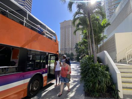 サインなし The Bus看板アラモアナ大通りに面するアクア・パームズ・ワイキキの正面入り口の前にトロリーが停車いたします。レアレアトロリー停留所サインはありません。ヒルトン・ハワイアン・ビレッジ滞在のお客様はこちらも便利です。