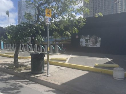 ダウンタウンとワードセンターの間にあるレストランやクラブが集結した飲食街、ソルト・アット・アワ・カカアコ。山側のコーヒーショップ「Insomnia」の前に停留所看板があります。